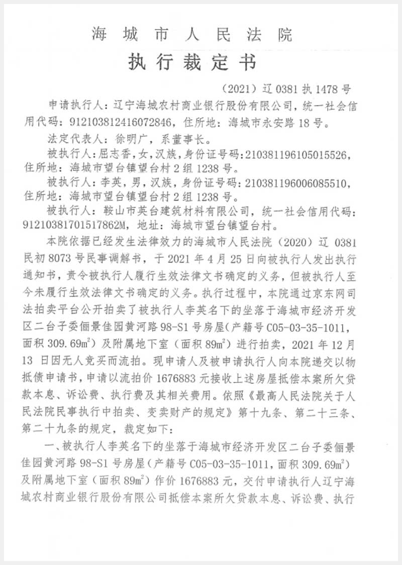 地址:海城經(jīng)濟(jì)技術(shù)開發(fā)區(qū)二臺(tái)子委儷景佳園 標(biāo)的號(hào):188