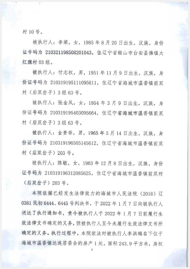 295號(hào) 海城市騰鰲鎮(zhèn)福安街道頤水嘉德二期6處房產(chǎn)