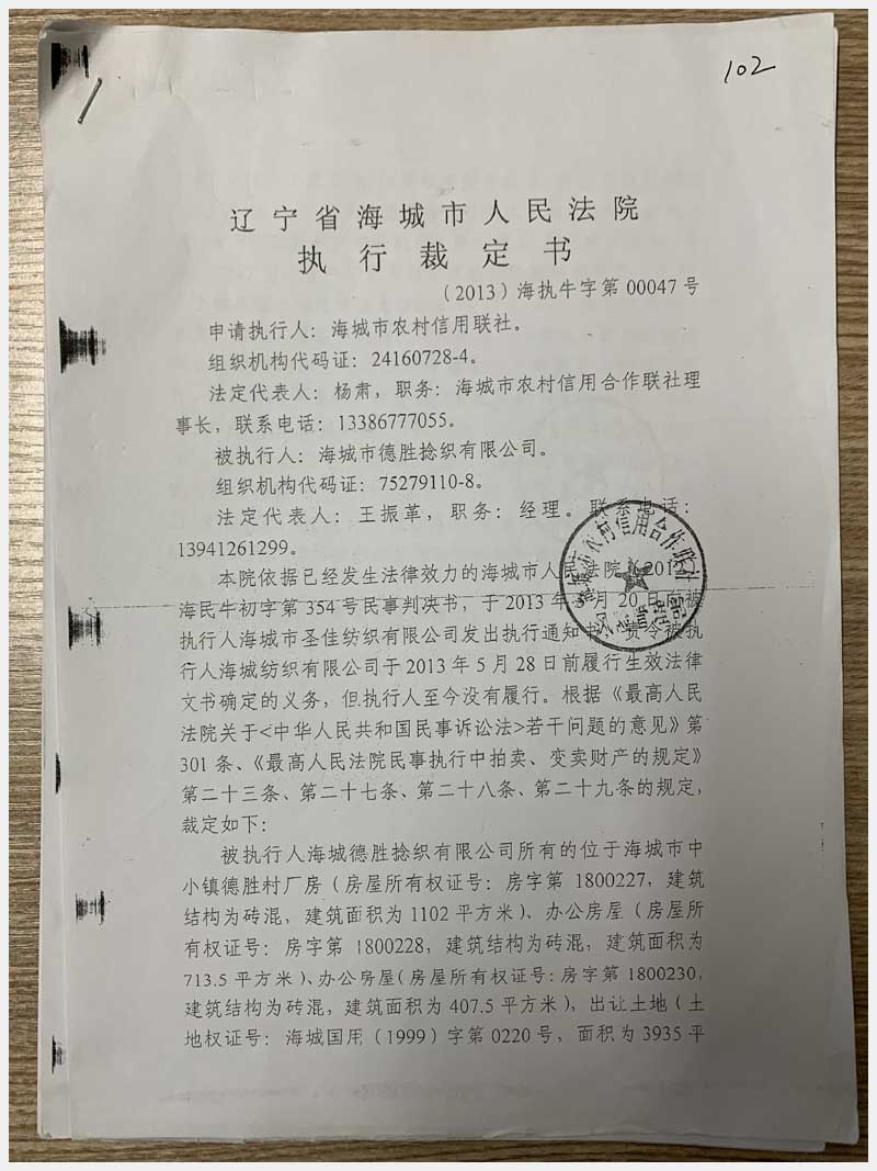 102號(hào) 海城市中小鎮(zhèn)德勝村房產(chǎn)及國(guó)有土地使用權(quán)